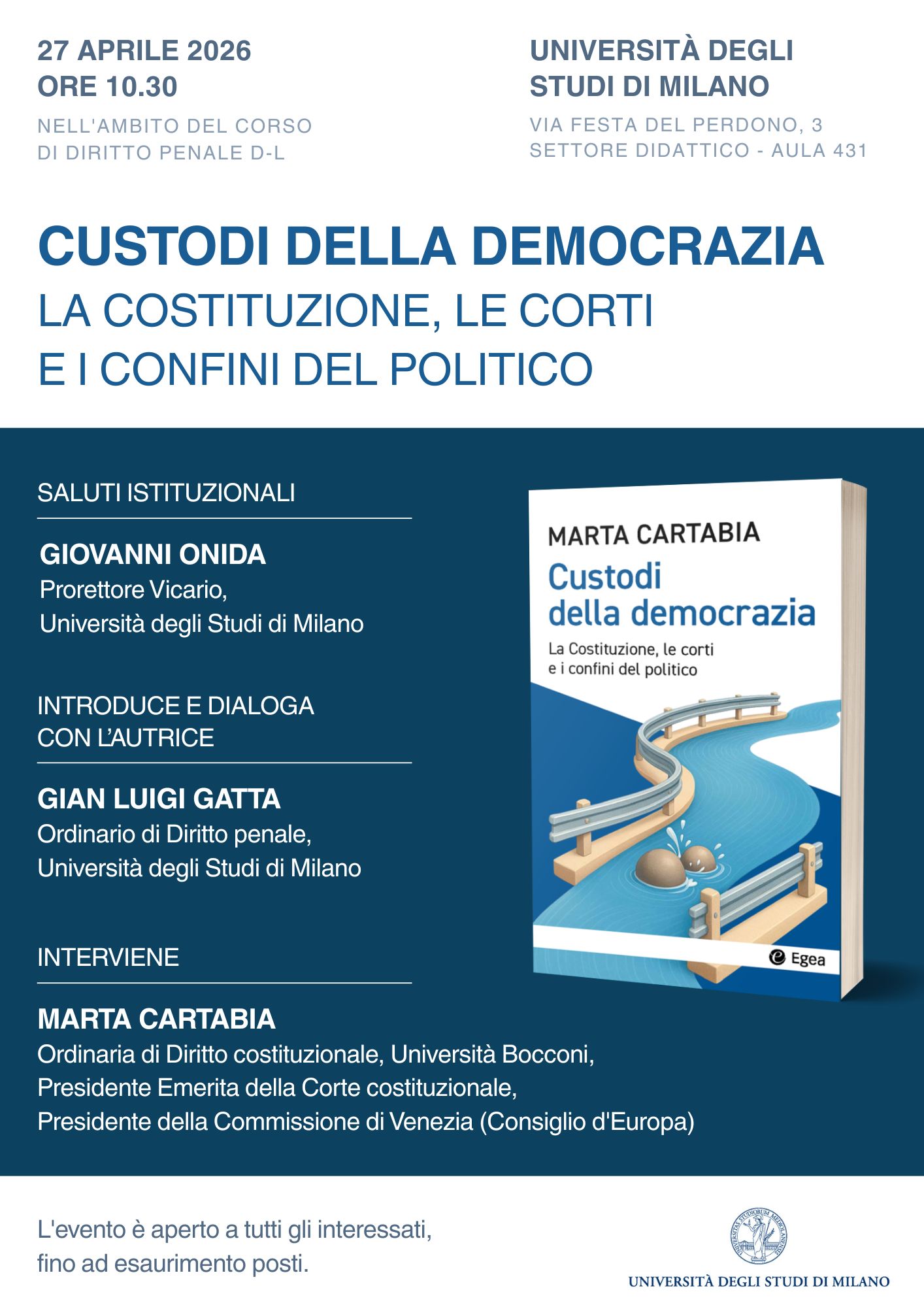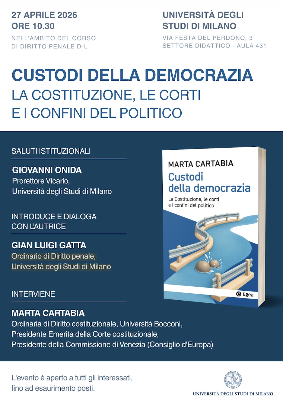 Segnaliamo ai lettori che il 27 aprile 2026, dalle 10.30 presso l'aula 431 dell'Universitò degli Studi di Milano, nell'ambito del corso di Diritto penale D-L (prof. Gian Luigi Gatta), si terrà l'incontro di presentazione del recente volume "Custodi della democrazia. La Costituzione, le corti e i confini del politico" di Marta Cartabia, Ordinaria di Diritto costituzionale presso l'Università Bocconi, Presidente Emerita della Corte costituzionale e Presidente della Commissione di Venezia (Consiglio d'Europa).